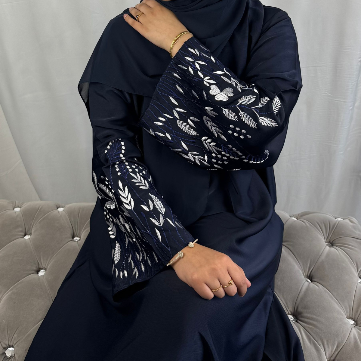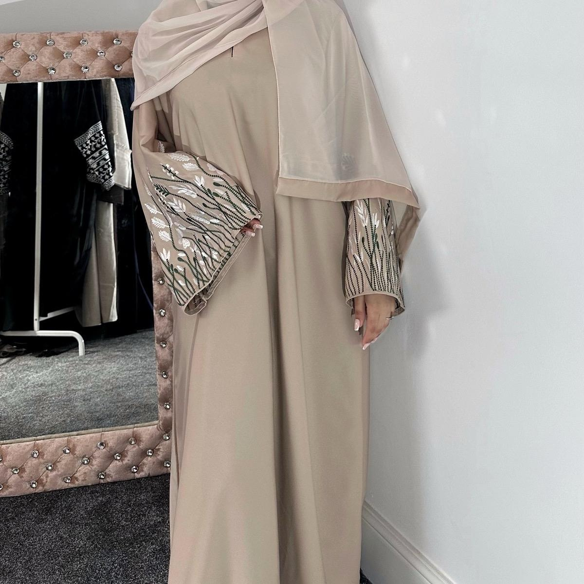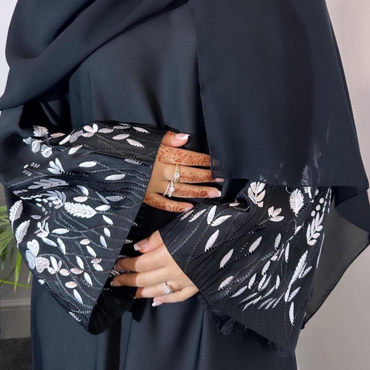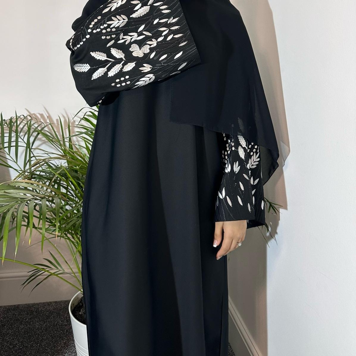 The sleeves of the abaya feature thread embroidery, which adds a decorative element to the abaya. The embroidery is subtle yet elegant, making it perfect for any occasion.