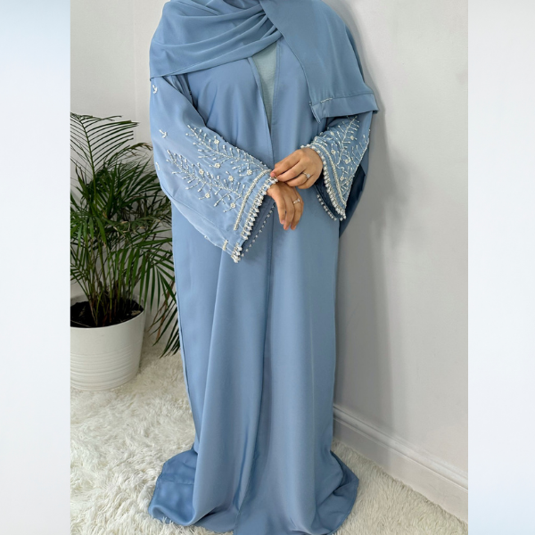 The set comes with a beautiful embellishment on the sleeves of the abaya, adding a touch of elegance and sophistication to the overall look of the abaya set.