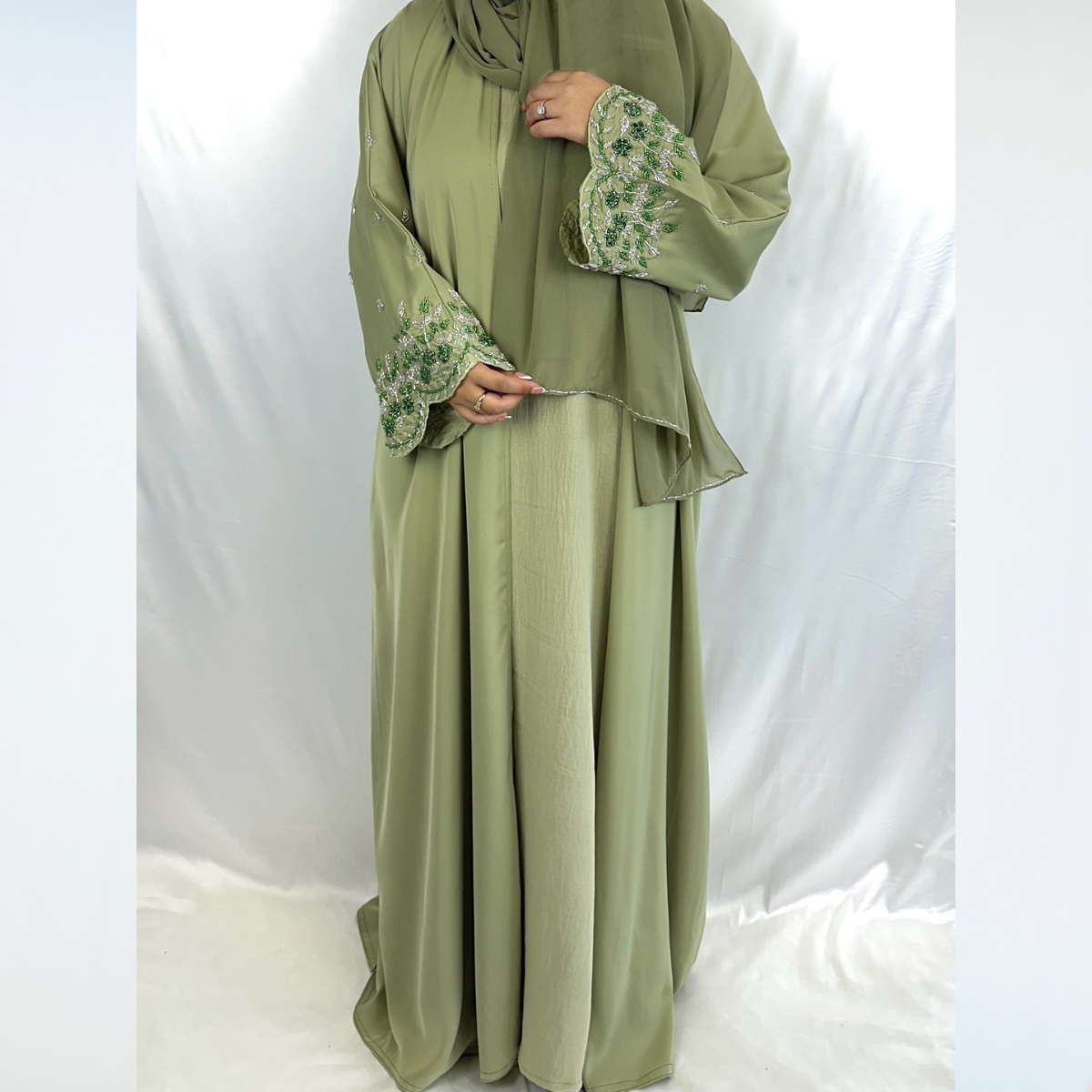 The set comes with a beautiful embellishment on the sleeves of the abaya, adding a touch of elegance and sophistication to the overall look of the abaya set.
