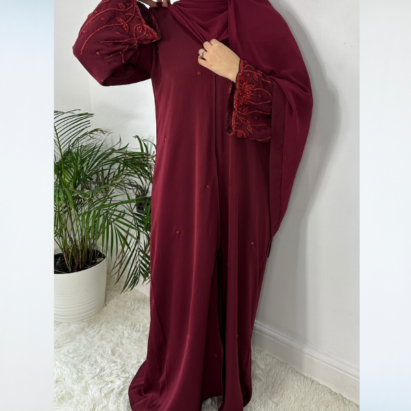 The Rahma abaya features beautiful embellishments on the sleeves, adding a touch of elegance, while maintaining a minimalist design at the front. It can be styled open for a relaxed look or closed for a more refined, sleek appearance.